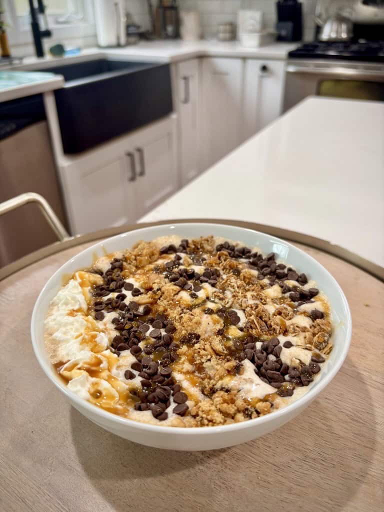 Now for the fun part—pour your blended milkshake into a bowl, ready your desired toppings, and get to whimsifying! We chose to sprinkle crushed chocolate chip cookies, chocolate chip cookie granola, and mini chocolate chips, include a designated whipped cream section, and finish it off with a drizzle of caramel sauce. *chef’s kiss* Feel free to include any additional toppings as you see fit; after all, a whimsical life relies on creativity!