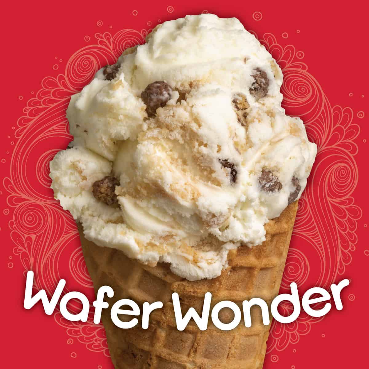 Reminiscent of a candy bar, you’ll wonder how you ever went without trying this flavor! Wafer Wonder is wafer flavored ice cream with wafer swirls and fudge coated wafer pieces.